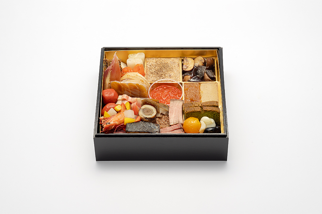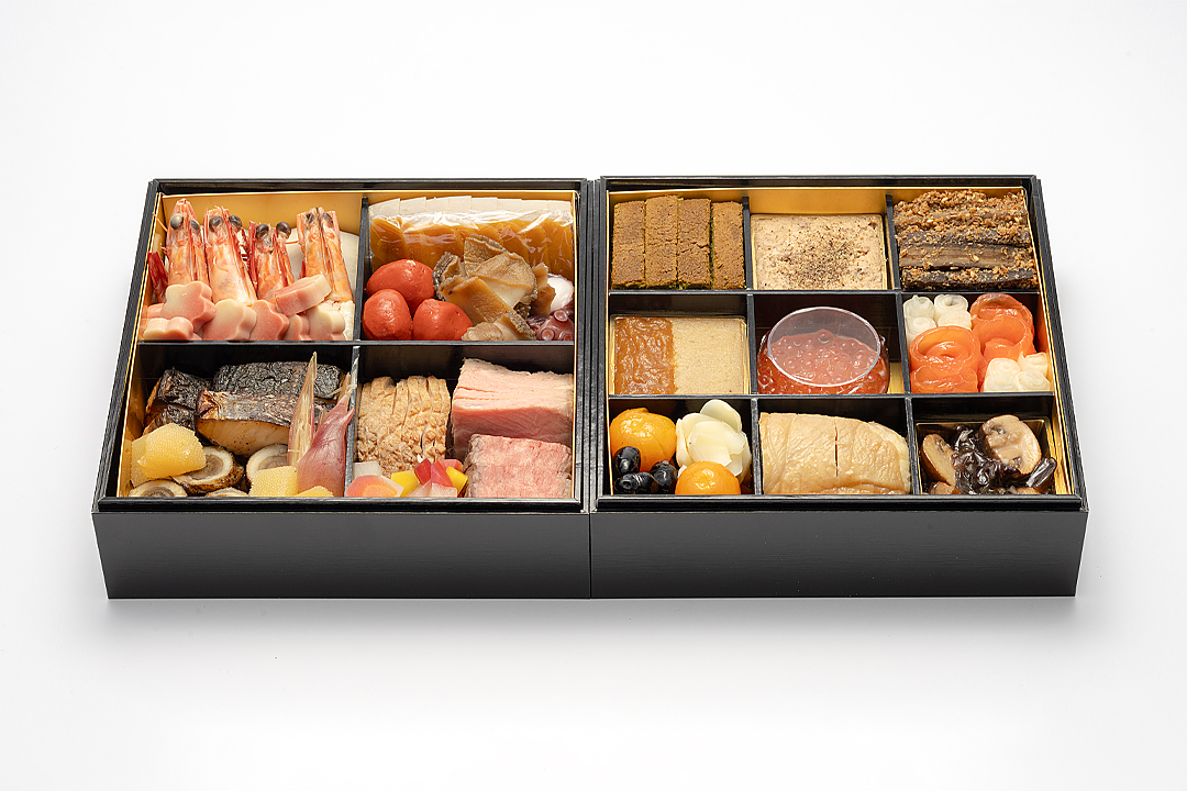 写真は2025年度分のおせち料理です。2026年度分は少し内容が変わる場合がございます。